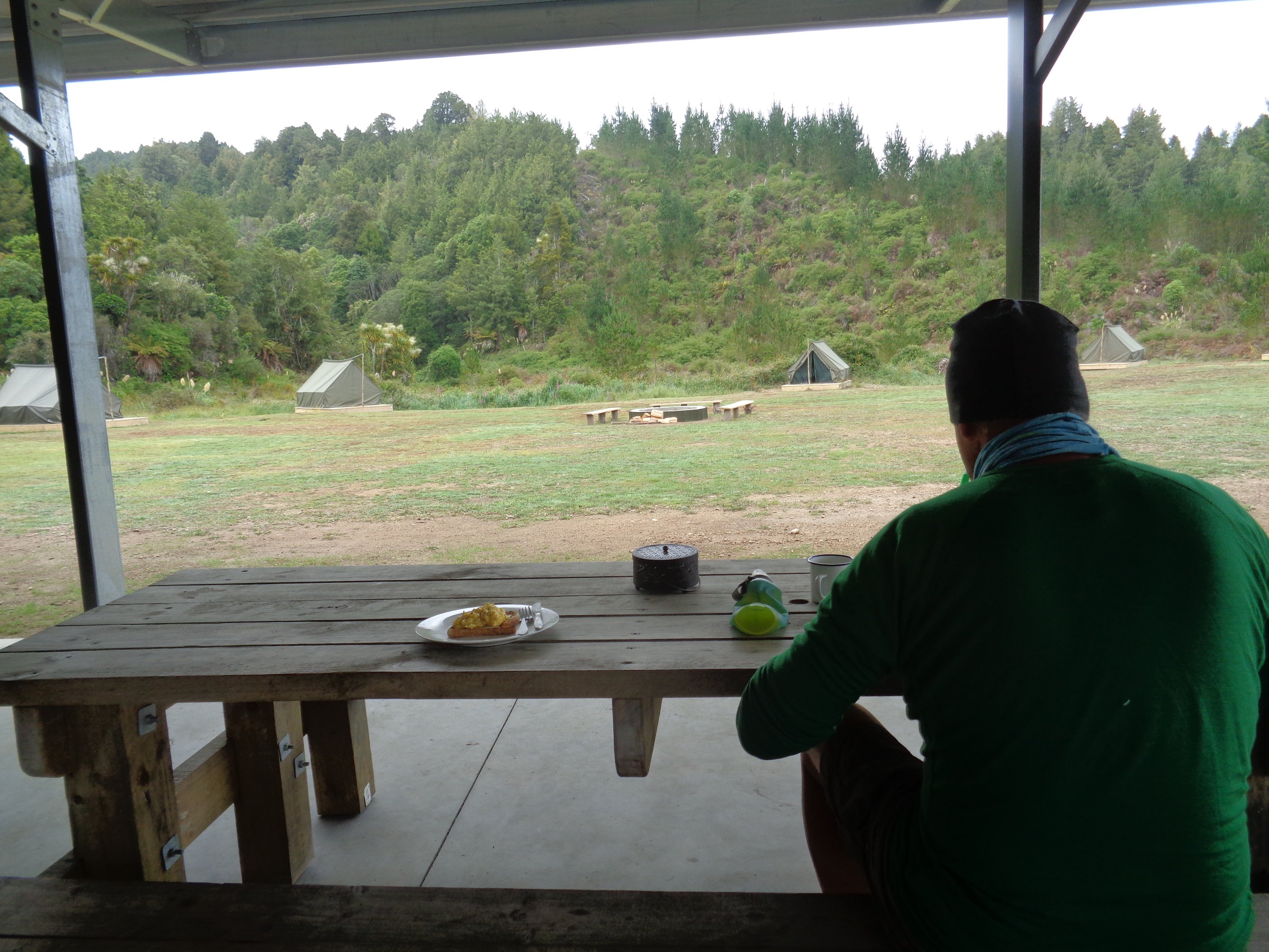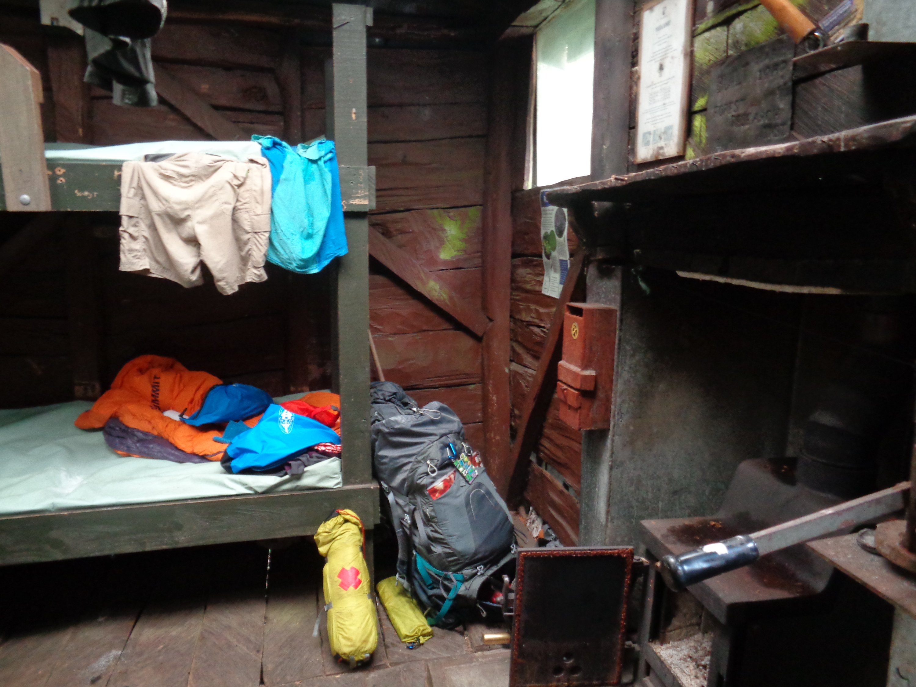 We did get drenched the first day though, the heavens threatened all day, and then opened when we were about 2hrs out from the hut. The Bog Inn hut was our intended destination, but as it was only a four bunk hut, we weren’t confident of our chances of a dry bed. Imagine our delight, after 45min through dripping forest we found it empty! Very rustic, but dry. Pete even got a fire going for a bit. Positively luxurious.
